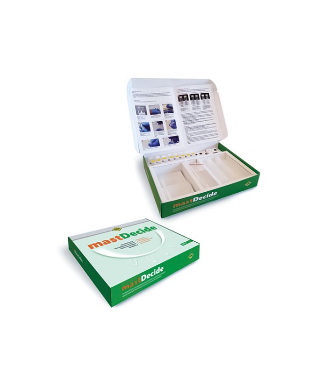 Test pronto all’uso con terreno liquido di coltura (agar) in provette (terreno 1: tappo bianco, terreno 2: tappo giallo), micropipette monouso, un sacchetto di smaltimento dei rifiuti per autoclave, provette per il prelievo del latte (per campioni di latte di quarto) e salviettine per la detersione delle mammelle/capezzoli.
